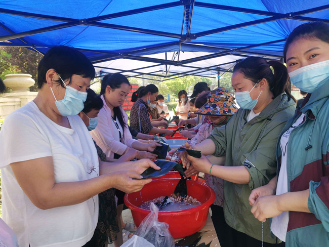 工作人員準(zhǔn)備好粽葉和泡好的糯米、蜜棗、紅豆等食材,大家各顯身手,拿粽葉、捋粽葉、做漏斗狀、填糯米、放餡料、壓緊實(shí)、封口、扎捆,巧手翻飛,不一會(huì)兒,一只只各式各樣的漂亮粽子就堆成了小山。盡管大家包粽子的水平參差不齊,但無(wú)論是技術(shù)嫻熟還是新手上路,大家都特別開(kāi)心,整個(gè)活動(dòng)現(xiàn)場(chǎng)歡聲笑語(yǔ),其樂(lè)融融,好不熱鬧......