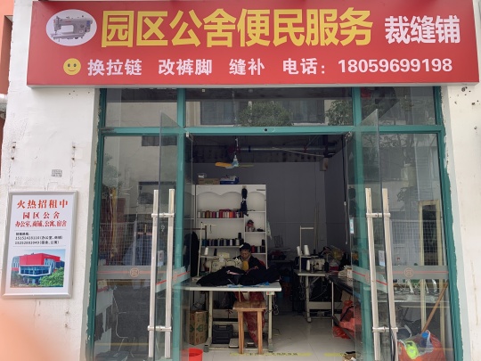 園區(qū)公舍便民服務(wù)裁縫鋪位于東吳尚城一層外圍沿街商鋪西首,經(jīng)營范圍:縫補衣物、修扁褲腳、更換拉鏈等修補衣物業(yè)務(wù)。