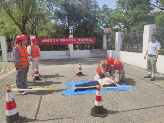 在園區(qū)為民河南閘站和利民河北閘站,分別模擬配電房火災(zāi)、維護(hù)人員觸電兩類典型事故場景開展應(yīng)急演練。針對電氣火災(zāi)事故,參演人員嚴(yán)格遵循應(yīng)急處置流程,依次完成切斷電源、報警聯(lián)絡(luò)、組織撤離、滅火器實(shí)操滅火等動作;針對觸電事故,則有序執(zhí)行斷電急救、撥打 120、心肺復(fù)蘇現(xiàn)場搶救等規(guī)范操作。兩類演練均以 “模擬事故 — 響應(yīng)處置 — 流程實(shí)操” 為脈絡(luò),使維護(hù)人員系統(tǒng)掌握不同事故的處理流程與協(xié)作要點(diǎn),切實(shí)提升應(yīng)急處置的規(guī)范性與團(tuán)隊配合效率。