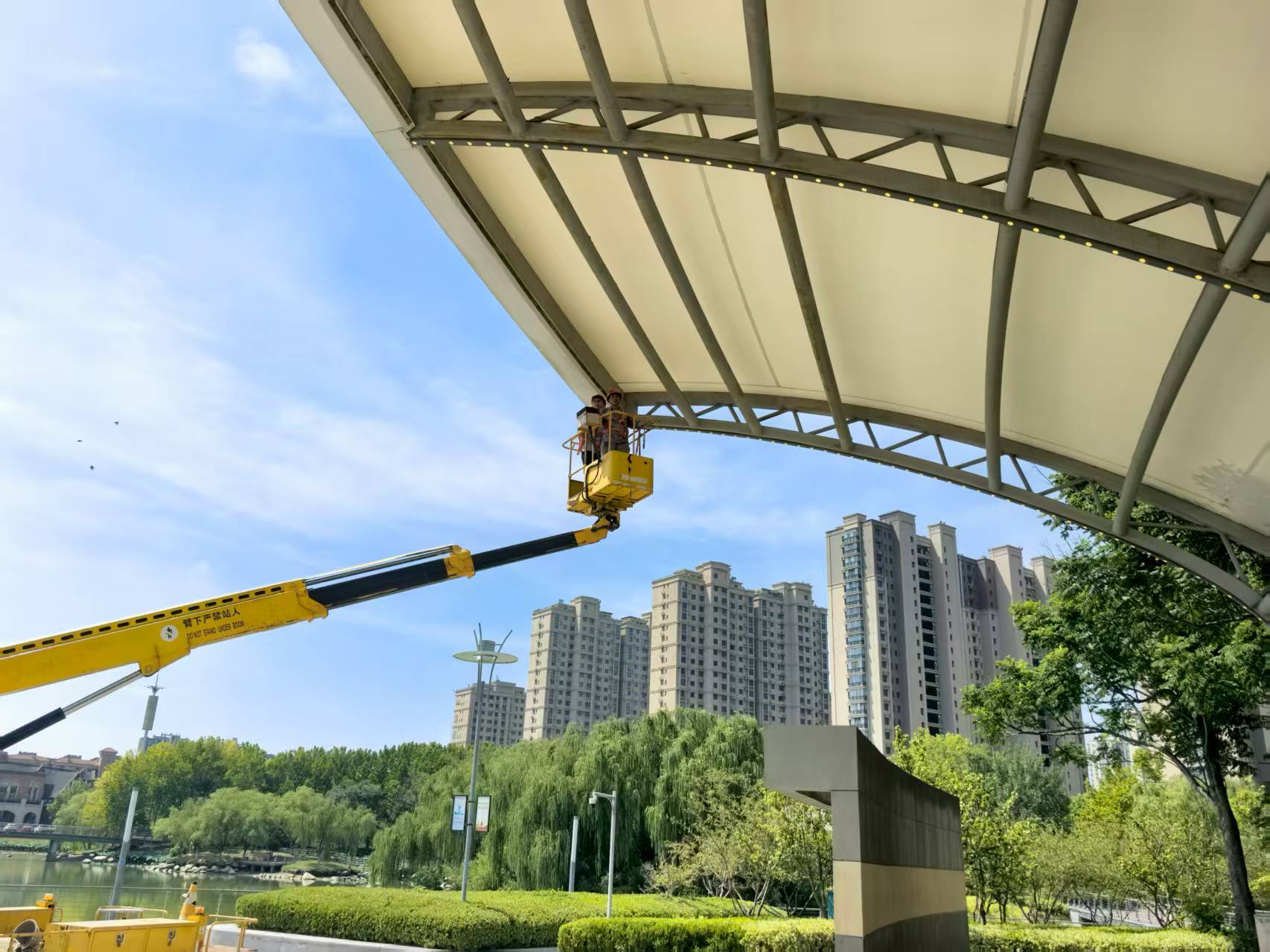 “今天在蘇州公園大舞臺進行登高作業(yè),維修頂部燈光。注意作業(yè)平臺與頂棚保持安全距離……”8月20日上午9點,夏日驕陽似火,蘇州公園作業(yè)現(xiàn)場氣溫已接近37℃。園區(qū)機電維護項目部技術負責人沈剛強和同事們開始了當天的第一場高空維修。
