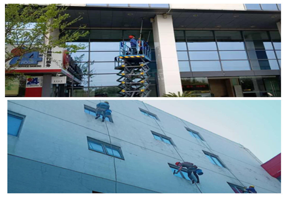 施工現(xiàn)場做好安全保障措施,現(xiàn)場清潔人員配戴安全頭盔、安全帶,嚴(yán)格按操作流程實(shí)施外墻清洗。