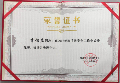 公司安防主管獲“宿遷市消防安全工作先進個人”稱號