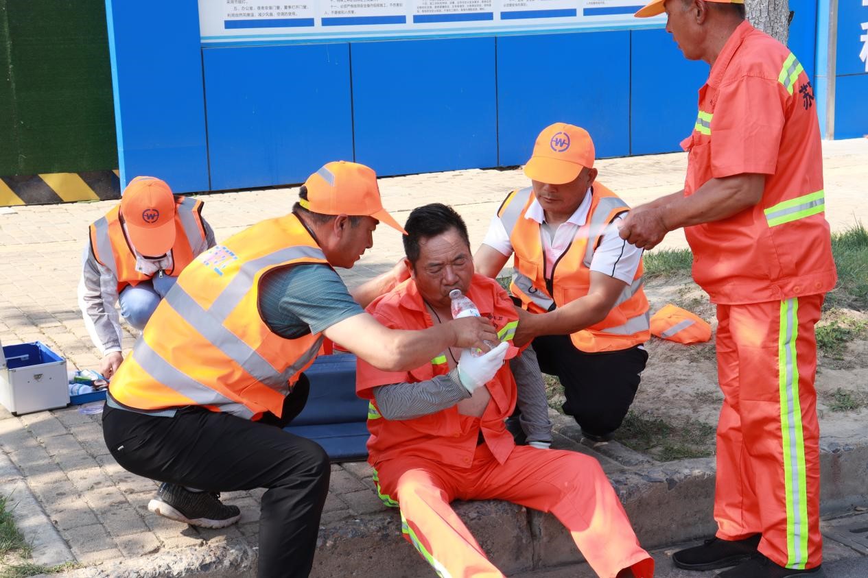 此次演練模擬一名環(huán)衛(wèi)工人在作業(yè)過程中,突然感到頭暈、心慌乏力,立即向主管人員電話求助。主管人員隨即趕到現(xiàn)場查看情況,發(fā)現(xiàn)環(huán)衛(wèi)工人躺坐在現(xiàn)場,面色潮紅、大汗淋漓,精神狀況不佳,系中暑跡象,立即向項目經(jīng)理報告,聯(lián)系應急救援人員,并呼喊附近作業(yè)人員將其攙扶到陰涼處,解開衣扣散熱,應急救援人員趕到現(xiàn)場后,立即用濕毛巾、酒精棉擦拭身體,涂上清涼油,喂服藿香正氣水、淡鹽水......,經(jīng)過初步救護,中暑人員癥狀得以緩解后,隨即將其送往園區(qū)社區(qū)衛(wèi)生服務(wù)中心進一步治療。