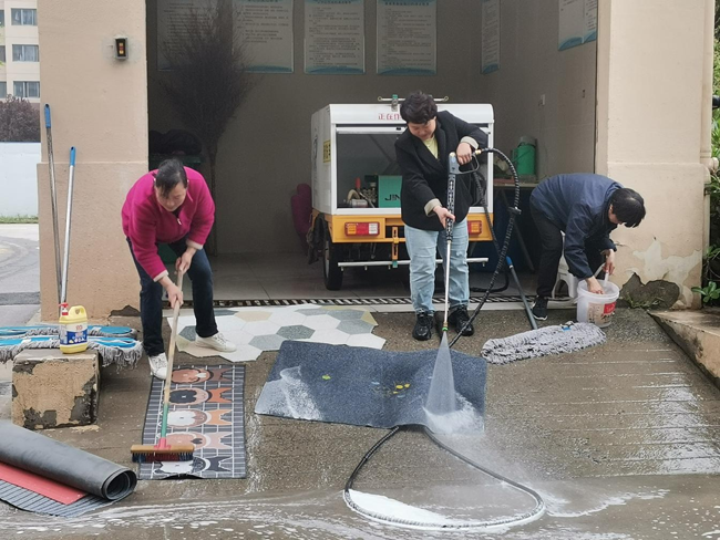 工作人員幫業(yè)主們清洗著臟臟的地毯,用高壓水槍耐心、仔細(xì)沖洗著地毯的正反面,小舉動(dòng),大關(guān)懷,每一次蹲下與起身,帶來(lái)的都是地墊的嶄新如初。