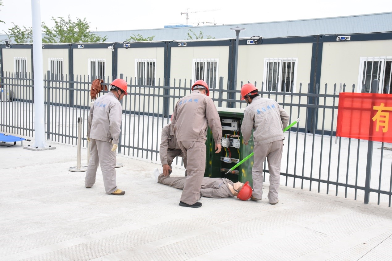 本次演練主要目的是熟悉人身觸電事故處理的流程,演練的重點(diǎn)突出在人身觸電后要及時(shí)斷開電源避免造成二次傷害和及時(shí)進(jìn)行現(xiàn)場急救等措施。演練以路燈維修人員在進(jìn)行配電柜內(nèi)部清潔時(shí)誤碰帶電部位發(fā)生人身觸電為主線,貫穿了從事故發(fā)生、現(xiàn)場救援、事故恢復(fù)、到預(yù)案關(guān)閉全過程。事故發(fā)生后,應(yīng)急指揮小組立即發(fā)布應(yīng)急預(yù)案啟動(dòng)信號(hào),并與就近醫(yī)療服務(wù)單位聯(lián)系,派人外出接應(yīng)急救車輛;同時(shí)現(xiàn)場救援組迅速切斷配電柜電源,將觸電人員轉(zhuǎn)運(yùn)至安全處進(jìn)行搶救;警戒組立即疏散無關(guān)人員,設(shè)置警戒線,維持現(xiàn)場秩序。參演人員密切配合,相互協(xié)助,嚴(yán)格按照演練要求和現(xiàn)場指揮命令有條不紊開展救援行動(dòng),圓滿完成了此次演練任務(wù)。